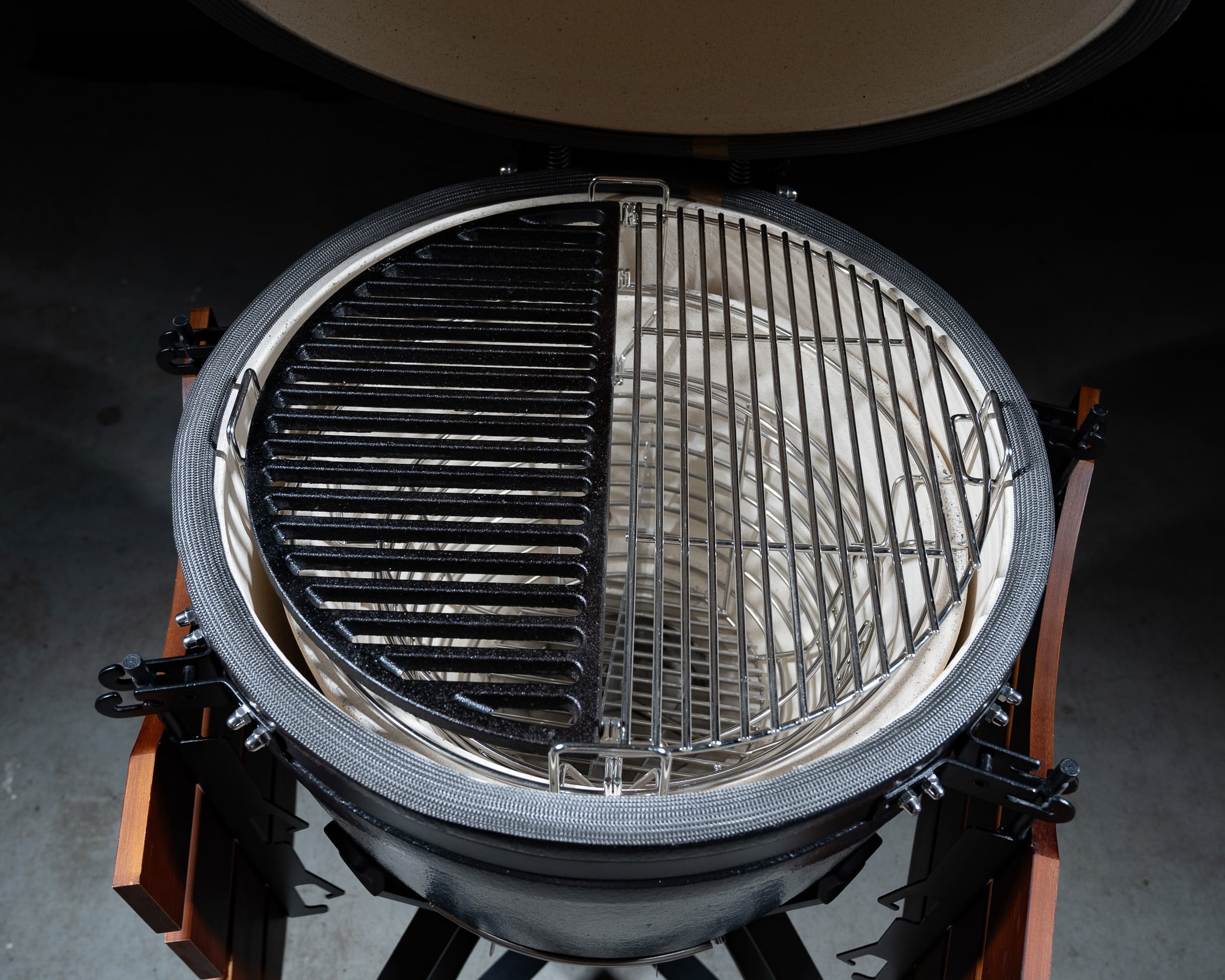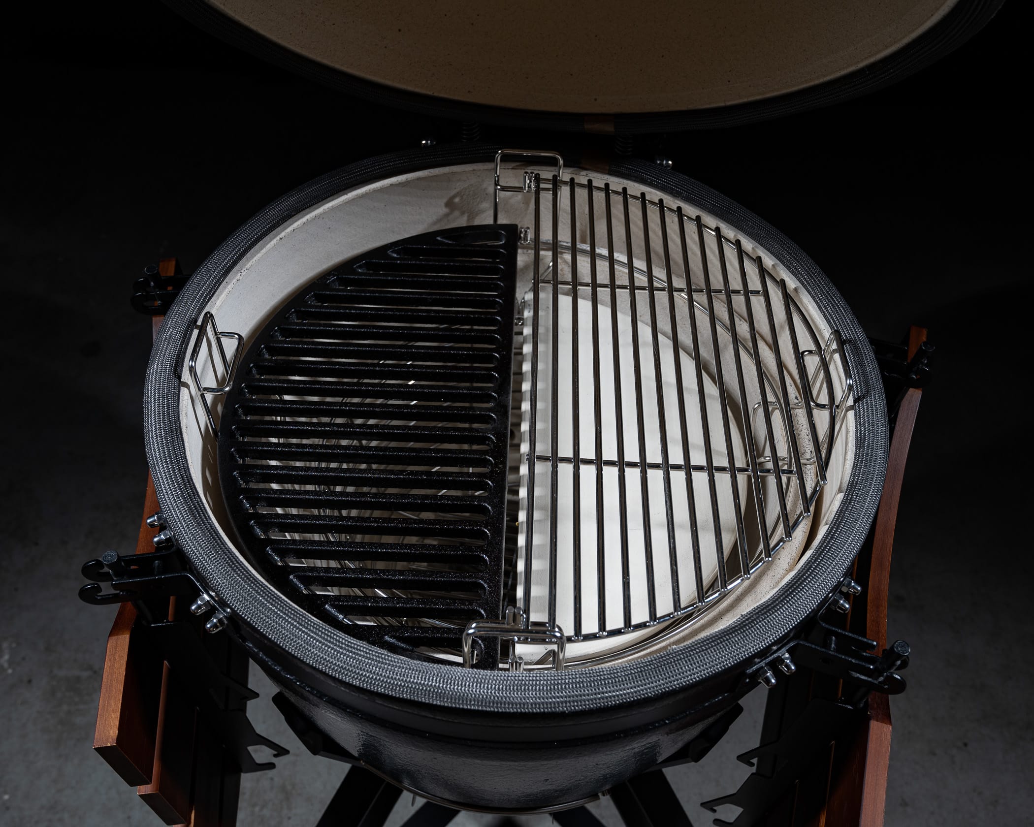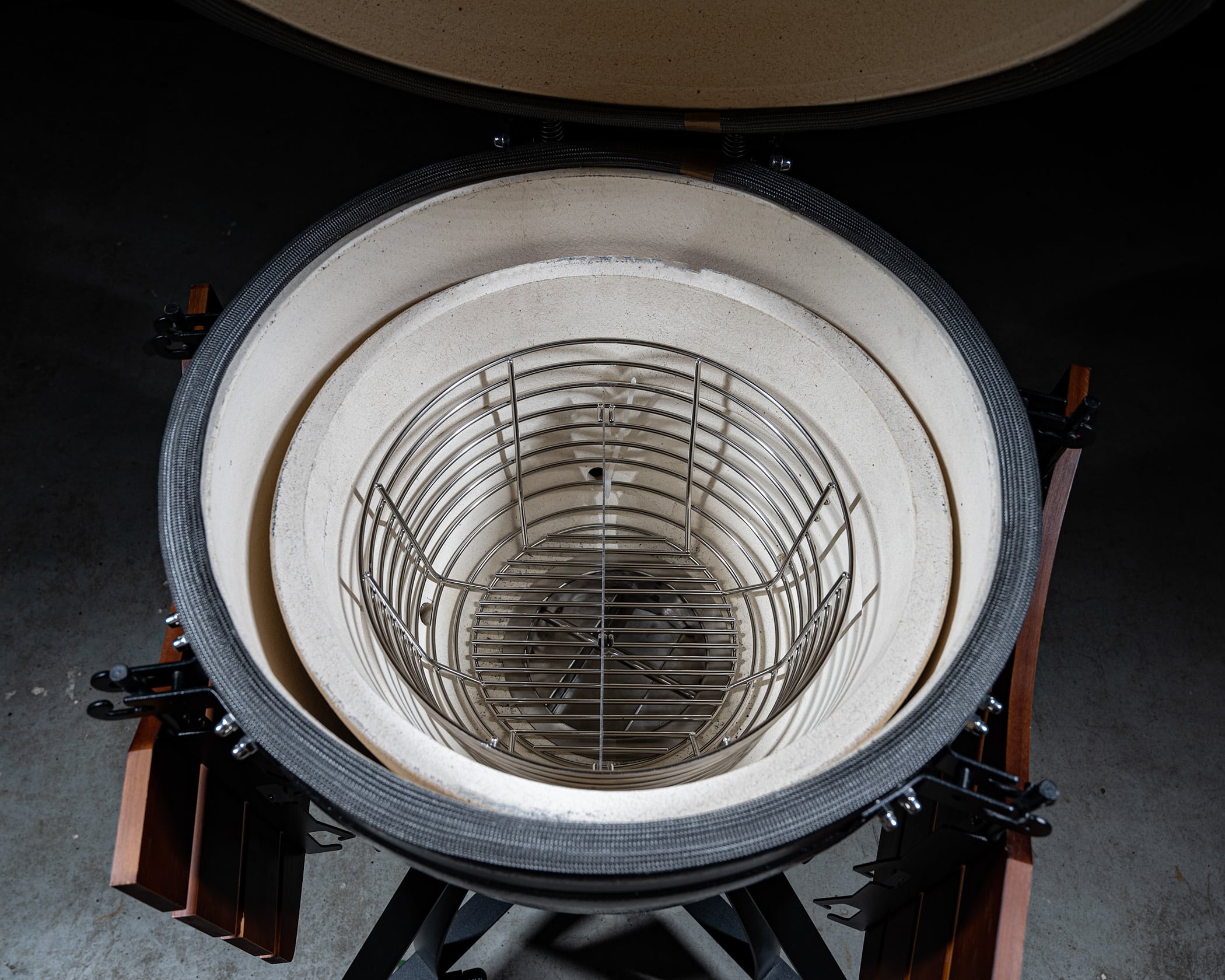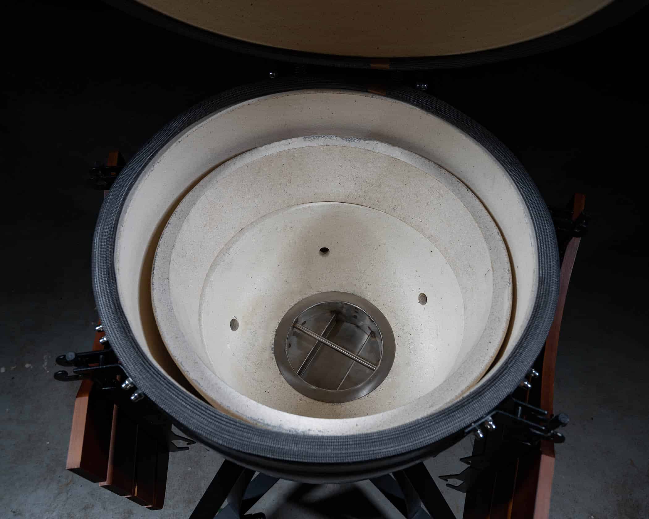 De beugels aan de voorzijde, die de kamado op zijn positie moeten houden, zijn bijna helemaal verdwenen, zodat je zonder afleiding volledig zicht hebt op het verfijnde design van onze Pro III kamado. Om de instabiliteit op te lossen, hebben we de kamado met een adapter vastgemaakt aan het onderstel.