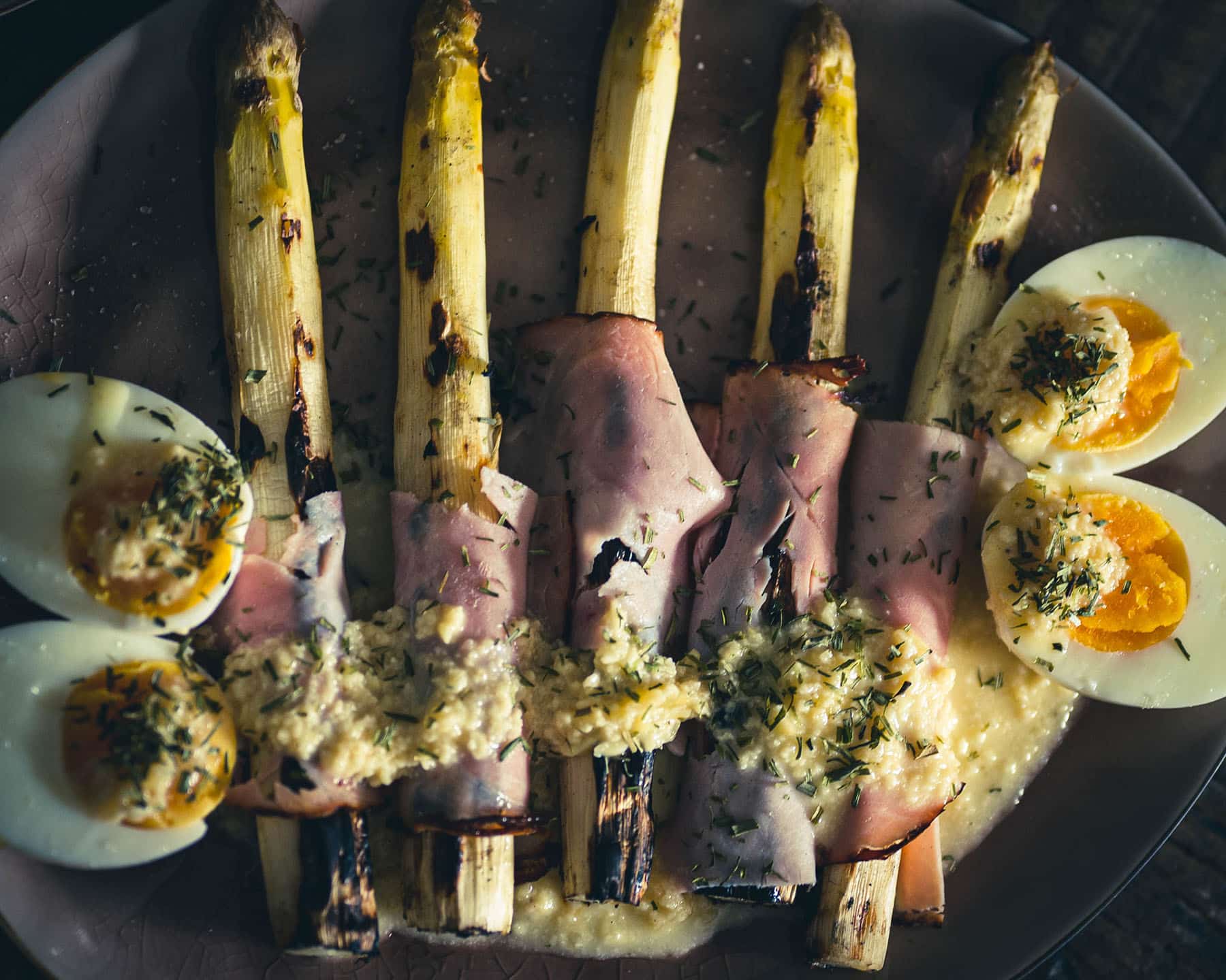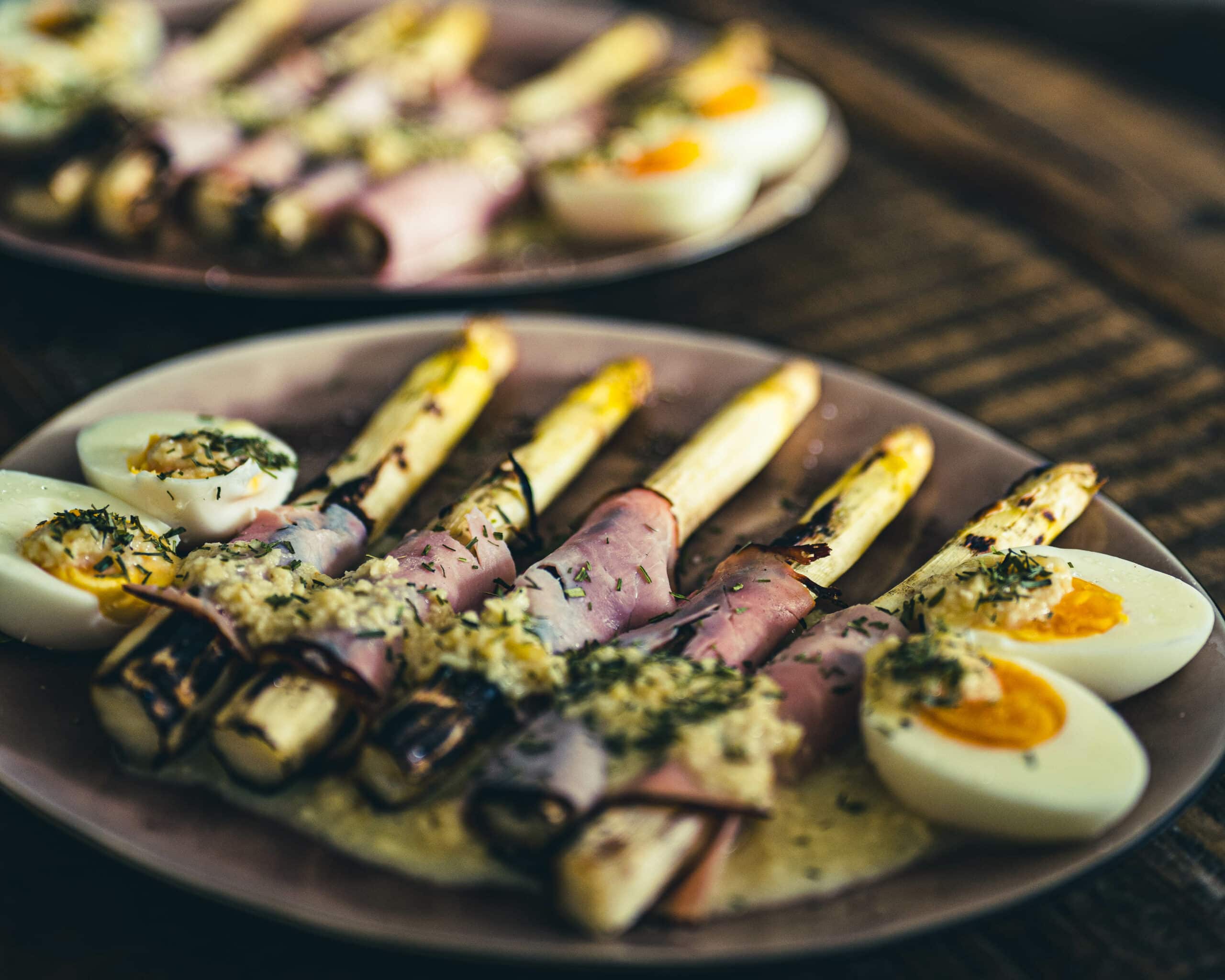 - Wikkel de asperges in een plakje rauwe ham op een serveerschaal. Schenk de kaassaus over de asperges en leg de gekookte eihelften er bovenop.
