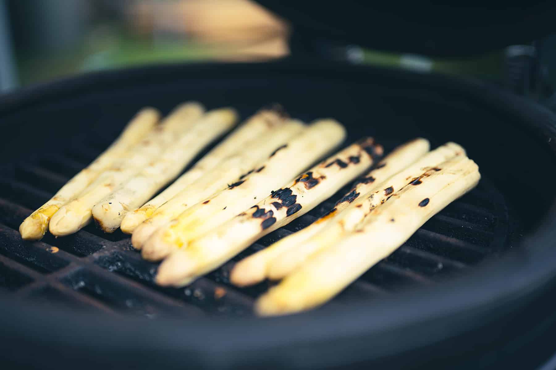 - Plaats de asperges op de BBQ en grill ze gedurende 3-4 minuten, waarbij je ze regelmatig omdraait, tot de asperges rondom mooi gegrild zijn.