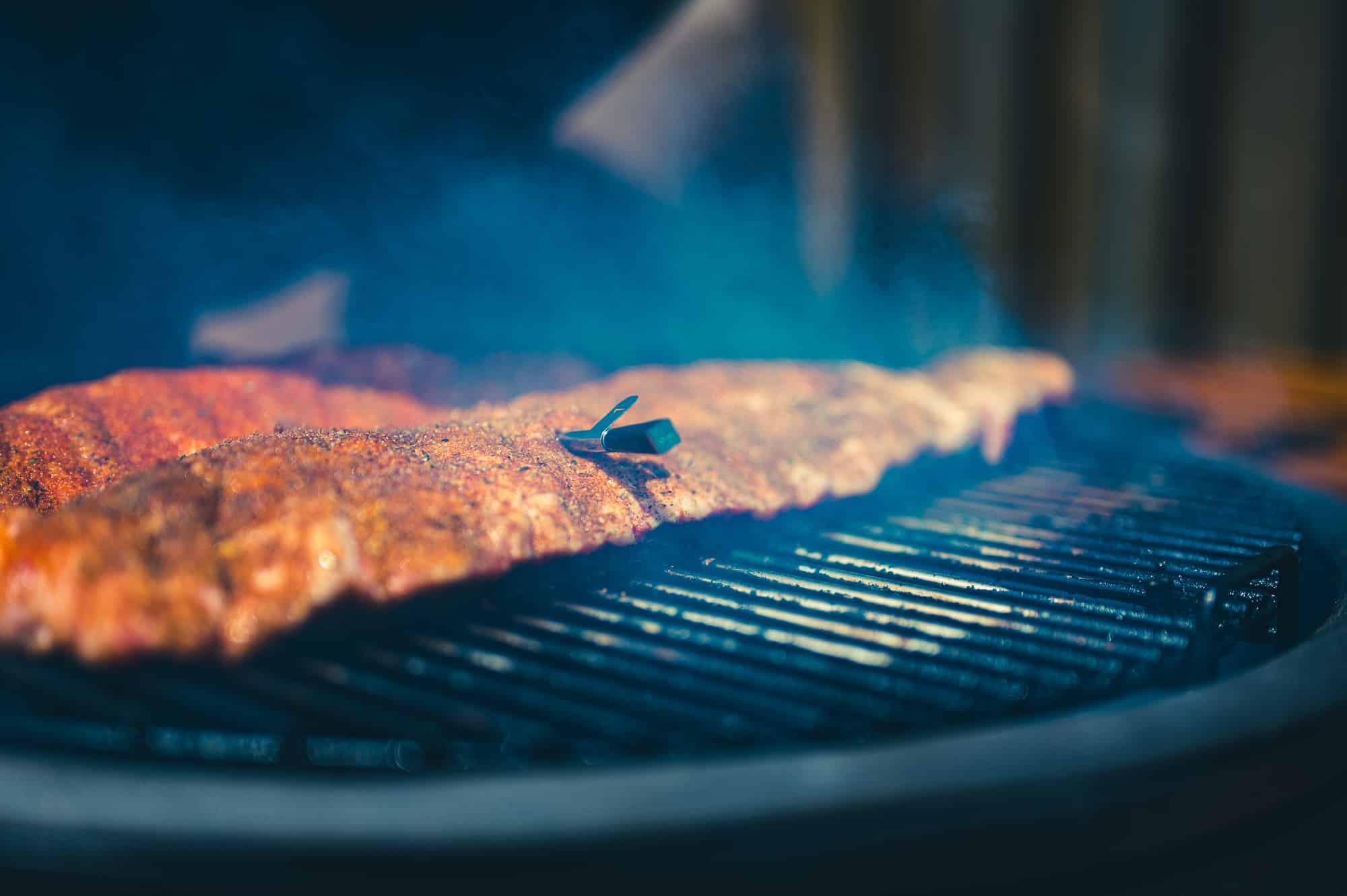 - By now the temperature of your kamado is at about 140 degrees and it is time to place the heat deflector and stainless steel grate. Place your Iberico ribs on top and let the smoke do its job.