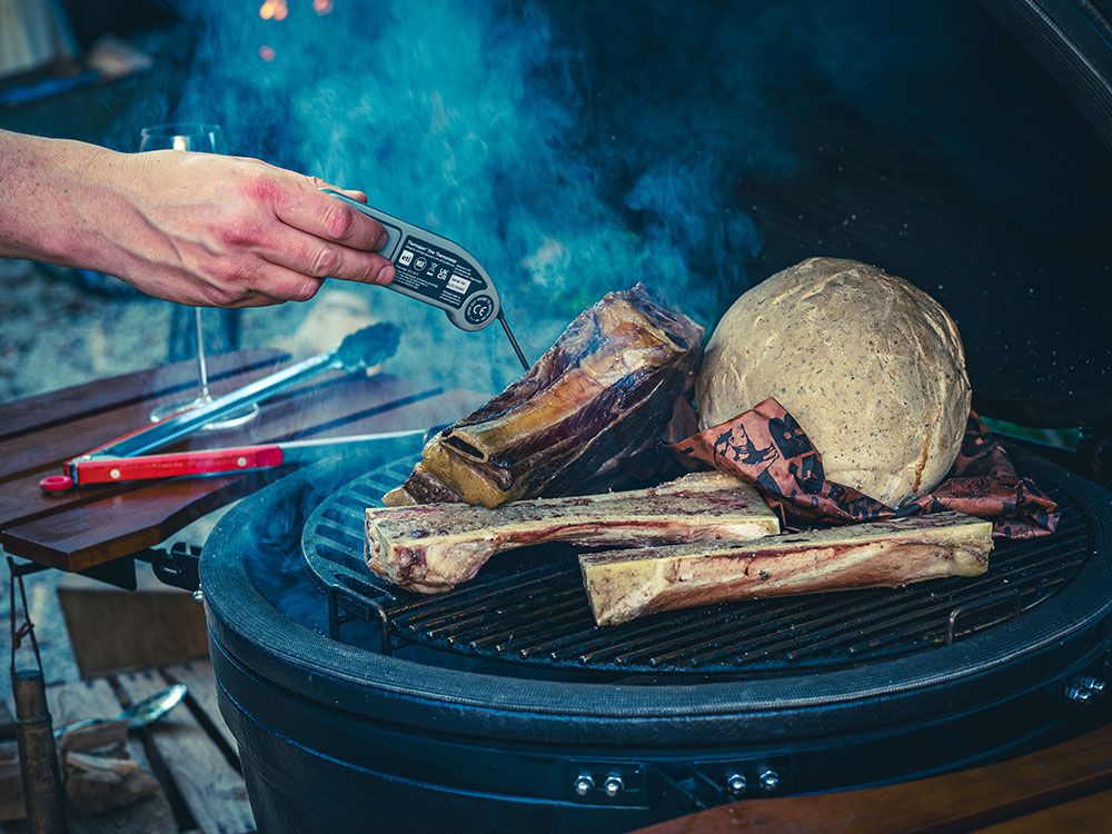 De Pro III is uitgerust met een extra grote thermometer, speciaal ontwikkeld voor optimale precisie en afleesbaarheid. Dankzij het duidelijke, contrastrijke design, zie je in één oogopslag de temperatuur in je kamado, zelfs van een afstand of bij weinig licht. De thermometer is stijlvol geïntegreerd in de dome en afgewerkt met het kenmerkende Grill Bill-logo, wat functionaliteit en design perfect combineert. Zo houd je altijd volledige controle over het vuur, van low & slow tot searing hot.